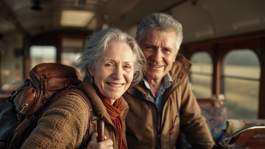 AI Generated Video. Video clip showing senior couple smiling and leaning together aboard vintage coach during countryside journey. Elderly woman carrying leather backpack and gripping handrail, companion standing close and smiling. Warm light and cozy clothing conveying nostalgia, companionship and relaxed travel mood. Useful for travel marketing, retirement lifestyle content, tourism brochures, senior wellbeing campaigns, and transportation promotion. Allowing headline overlay, lower-third text, and thumbnail extraction for web or social use. Color grading and shallow depth of field creating intimate cinematic look suitable for storytelling about rediscovering adventure and intergenerational travel.