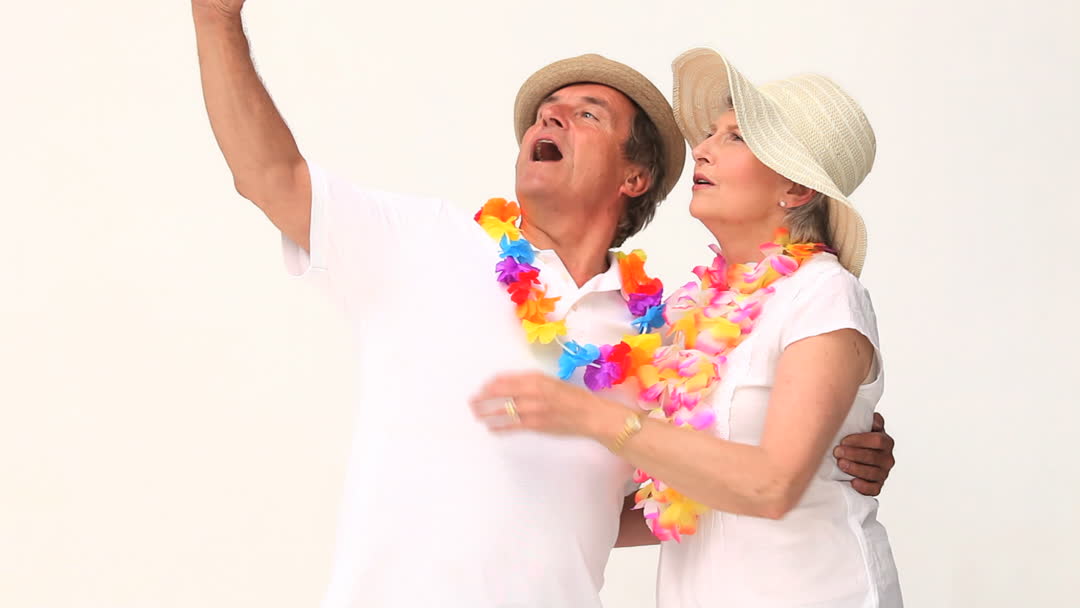 Senior couple dressed in Hawaiian-themed attire enjoying a fun moment taking a selfie against a white background. This video signifies travel, fun, and leisure, ideal for use in promotional materials for vacation packages, senior lifestyle articles, or retirement community advertising.