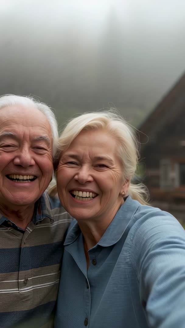 AI Generated Video. Senior couple taking selfie on misty chalet porch, smiling and laughing while leaning close together in vertical video. Fog and rustic cabin background creating cozy, intimate mood with soft, natural tones. Close-up framing and vertical orientation making clip ideal for social media reels, stories, mobile ads, and travel vlogs. Use for retirement community promotions, senior lifestyle campaigns, tourism marketing, family and anniversary content, healthcare and wellness messaging. Consider adding warm music, light grading, and text overlay for promotional banners or mobile-first landing pages. Clip offering authentic emotion, clear facial expressions, and crop-safe areas for titles and captions.