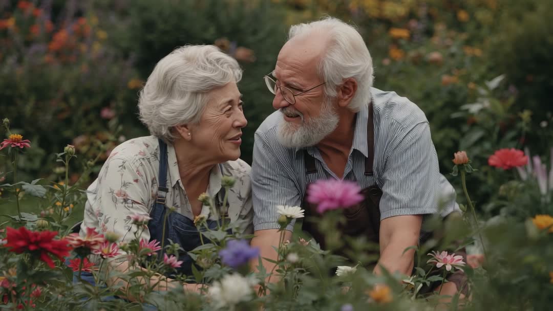 - Senior Couple Tending Flower Garden Sharing Warm Laughter in Backyard