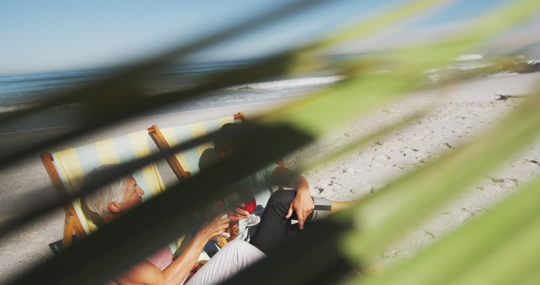 Senior couple enjoying a relaxed moment at a tropical beach, shaded by palm leaves. They sit in deck chairs near the shore, toasting each other and relishing the sunny scenery. The video captures a serene beach vacation ideal for promotions related to travel, relaxation, and retirement lifestyle content.