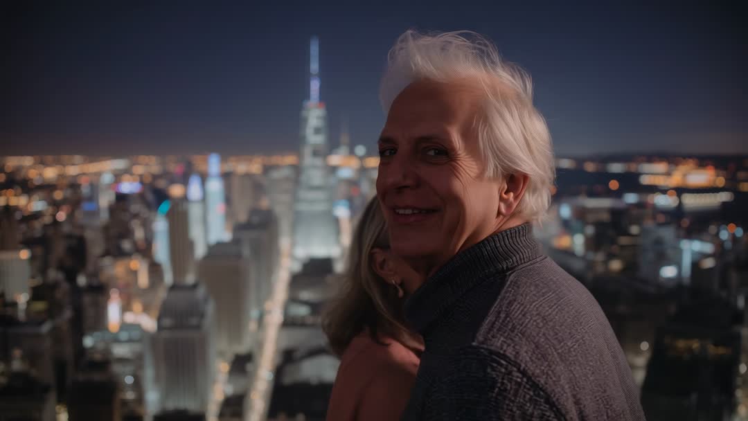 - Senior couple turning and smiling on rooftop overlooking illuminated city skyline at night