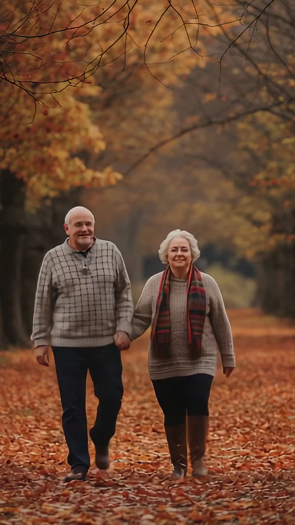 AI Generated Video. Vertical video showing senior couple walking hand in hand along leaf-covered park path during autumn. Warm golden foliage forming natural canopy overhead, soft background blur creating intimate mood. Couple wearing cozy sweaters and plaid scarf, smiling and enjoying unhurried stroll while leaves crunch underfoot. Camera gently tracking couple on centered path, vertical frame emphasizing tall trees and falling leaves. Use cases include marketing campaigns focusing on retirement, senior wellness, relationship and caregiving services; seasonal promotions for fall fashion, travel and outdoor activities; social media vertical ads, reels and stories; lifestyle blogs, greeting cards and postcards; senior living and healthcare websites; mindfulness and slow living content. Clip working well as opener, transition shot, or background for voiceover and inspirational text overlays. Color palette featuring warm oranges, golds and browns suiting autumn campaign designs. Suggested editing: slow 24-30 fps, gentle color grading for warm tones, optional soft vignette for cinematic feel.