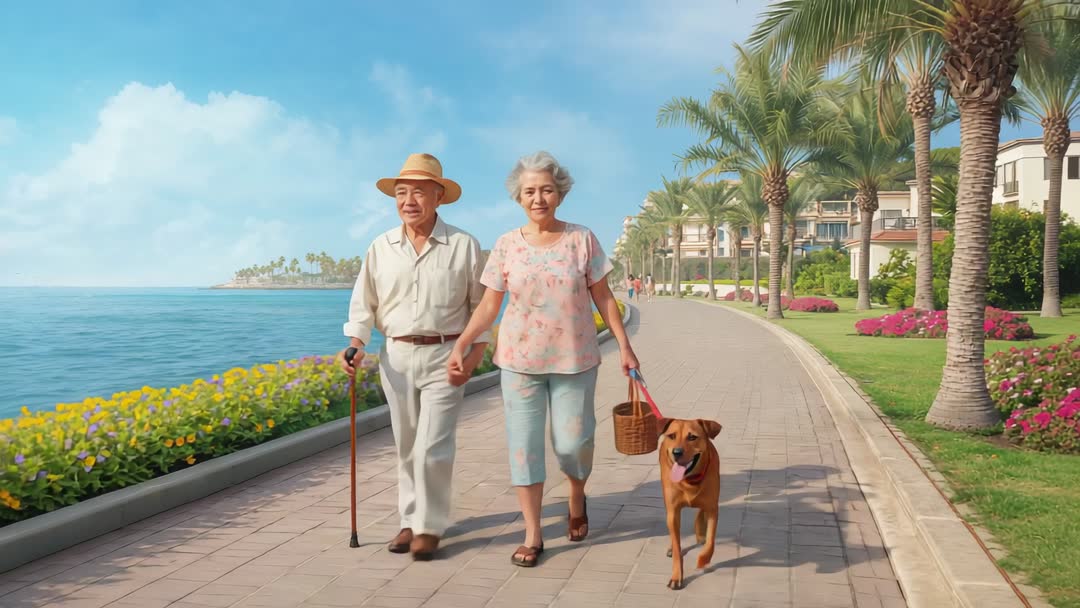 AI Generated Image. Footage showing senior couple walking hand-in-hand along palm-lined seaside promenade, man using cane, woman carrying wicker basket, medium-sized dog walking on leash. Bright sunny day with turquoise ocean, manicured flowerbeds and resort villas in background. Ideal for promoting senior wellness, retirement living, travel and tourism, coastal resort marketing, healthcare and physiotherapy campaigns, pet-friendly community promotions, lifestyle blog posts, social media ads and corporate presentations. Useful as video intro, background B-roll, travel commercial, educational clip about active aging, greeting card animation, real estate brochure visual or wellness seminar opener. Colorful composition and relaxed pacing conveying companionship, healthy lifestyle, leisure and scenic resort living.
