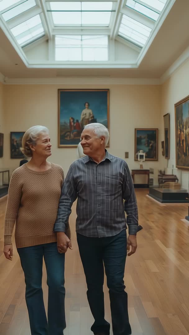 AI Generated Video. Vertical clip showing senior couple walking hand in hand through museum gallery, smiling and admiring paintings under large skylight. Warm natural light highlighting parquet floor and classical sculpture displays, creating calm, intimate mood. Useful for promoting retirement travel, cultural tourism, senior lifestyle content, healthcare and wellness campaigns, dating and companionship stories. Ideal for social media reels, mobile ads, website hero banners, television spots, documentary sequences. Suggested edits include 15s close-up focusing on smiles, 30s mid-shot showing gallery architecture, and slow tracking reveal for emotional impact. Leave room for voiceover, subtitles, or soft instrumental music to enhance narrative.