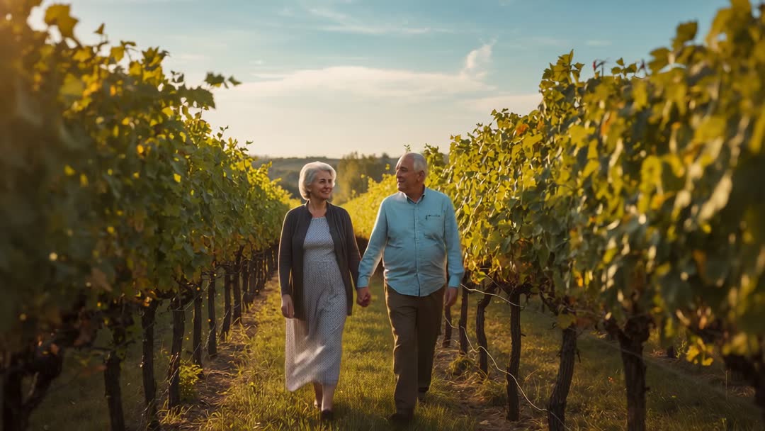 - Senior Couple Walking Hand in Hand Through Sunlit Vineyard Rows at Golden Hour