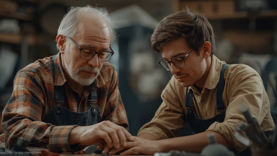 AI Generated Image. Showing senior craftsman guiding young apprentice through precise hand placement on workpiece at workbench. Demonstrating hands-on woodworking technique, tool handling, and mentorship moments with warm, focused atmosphere. Highlighting skill transfer, traditional craftsmanship, and intergenerational learning inside woodshop environment. Suitable for online woodworking tutorials, apprenticeship program promotion, vocational training materials, craft business marketing, magazine features, blog posts about mentorship, social media reels, and instructional video libraries. Offering editing options such as crop tight on hands for hero thumbnail, add step-by-step captions for tutorial use, include voiceover narration for instructional clarity, and use slow-motion for technique emphasis. Conveying authenticity for brand storytelling, training course promotion, community carpentry events, and DIY project guides.