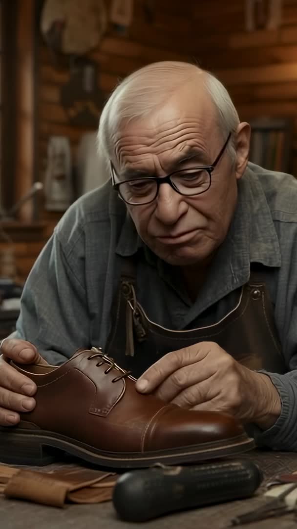 AI Generated Image. Vertical video showing senior craftsman inspecting seam of handmade leather shoe, focusing on careful quality control and fine stitching. Close-up of hands and tools, with warm wood-paneled workshop background suggesting tradition and skill. Footage working well for brand storytelling, artisanal product pages, shoe repair tutorials, heritage craftsmanship documentaries, and social media Reels or TikTok. Ideal for hero clips on e-commerce landing pages, advertising campaigns emphasizing durability and premium materials, or editorial features about traditional trades. Composition optimized for mobile viewing, allowing easy use in Stories, Reels, and in-stream ads. Suggestions: add soft instrumental music, record voiceover explaining craft process, overlay product details and pricing, or use split-screen to show before-and-after restoration.