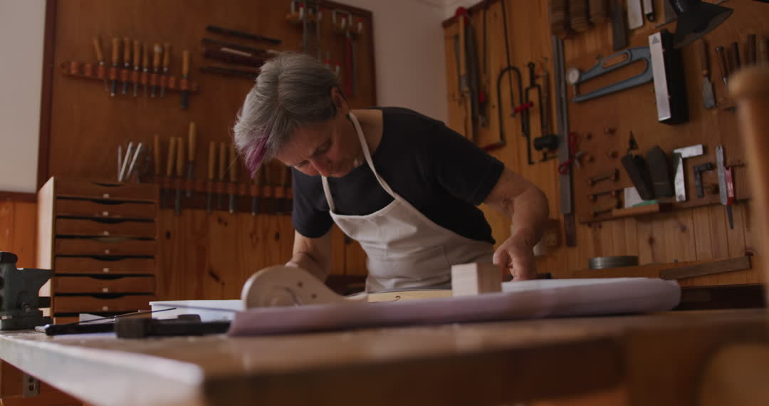 A senior Caucasian female luthier focuses intently while shaping a violin on a workbench in her well-equipped workshop. Surrounded by various tools hanging on the wall, she embodies the art of traditional woodworking and craftsmanship. This video can be used in articles or promotional material highlighting hobbyists, skilled trades, craftsmanship, or the creation of musical instruments. It evokes dedication and precision in an artisanal setting.