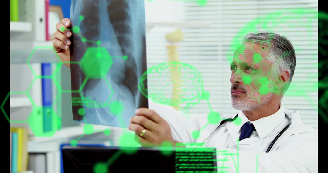 An elder male doctor examining an X-ray with green digital and scientific overlays symbolizing advanced medical data processing. Ideal for illustrating innovation in healthcare, medical technology advancements, and future health services. Could be used in medical publications or technology presentations to show the integration of technology in healthcare.