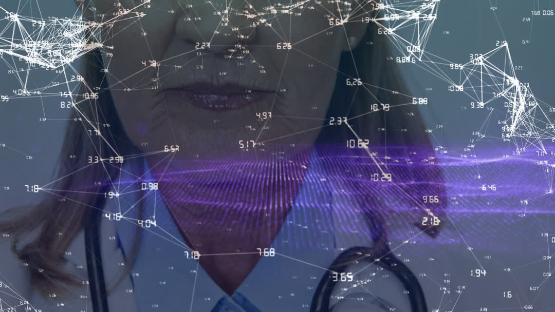 A senior female doctor is set against an animated digital background with connections and network graphics. The video symbolizes the integration of technology in modern healthcare, illustrating concepts of telemedicine, data exchange, and healthcare innovation. Useful for articles and marketing materials focusing on telehealth, digital medical advancements, and the future of healthcare.