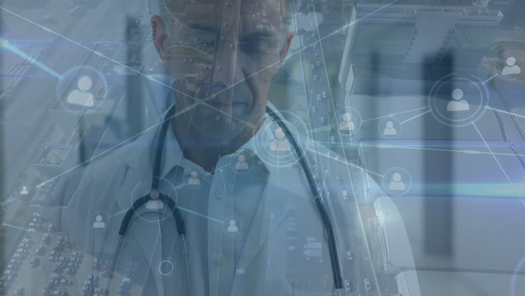 Overlay of network icons and a senior male doctor creates a modern digital healthcare concept, symbolizing technological connectivity and innovation in medical environments. Use this for articles or presentations discussing telemedicine, digital health transformation, or featuring the integration of IT solutions in healthcare.