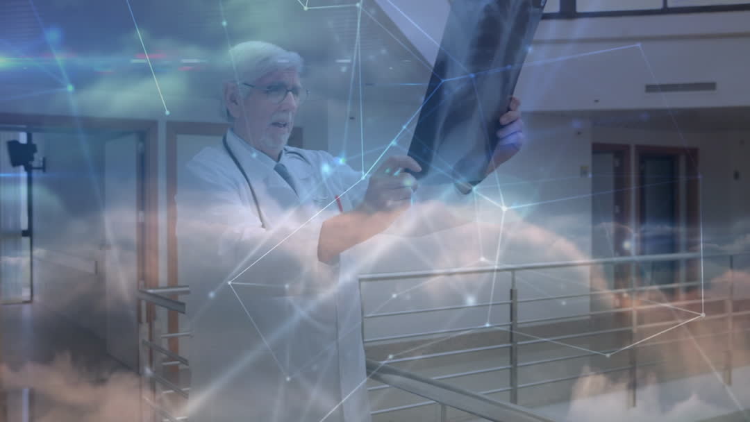 A senior doctor is reviewing an X-ray while surrounded by a digital network overlay, representing advanced medical technology and innovation in healthcare. This video is ideal for use in medical articles, futuristic healthcare presentations, and technology-enhanced care brochures.