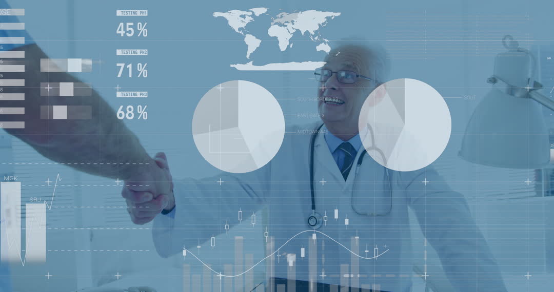 The video presents a senior male doctor in a friendly handshake with a patient, overlaid with financial graphs and data. This visuals implies a connection between healthcare services and economic values or analytics. Ideal for topics involving healthcare industry finance, medical economics, health data analytics, doctor-patient relationships, and professional collaboration in healthcare. Suitable for medical articles, business presentations, and discussions on the intersection of health and economy.