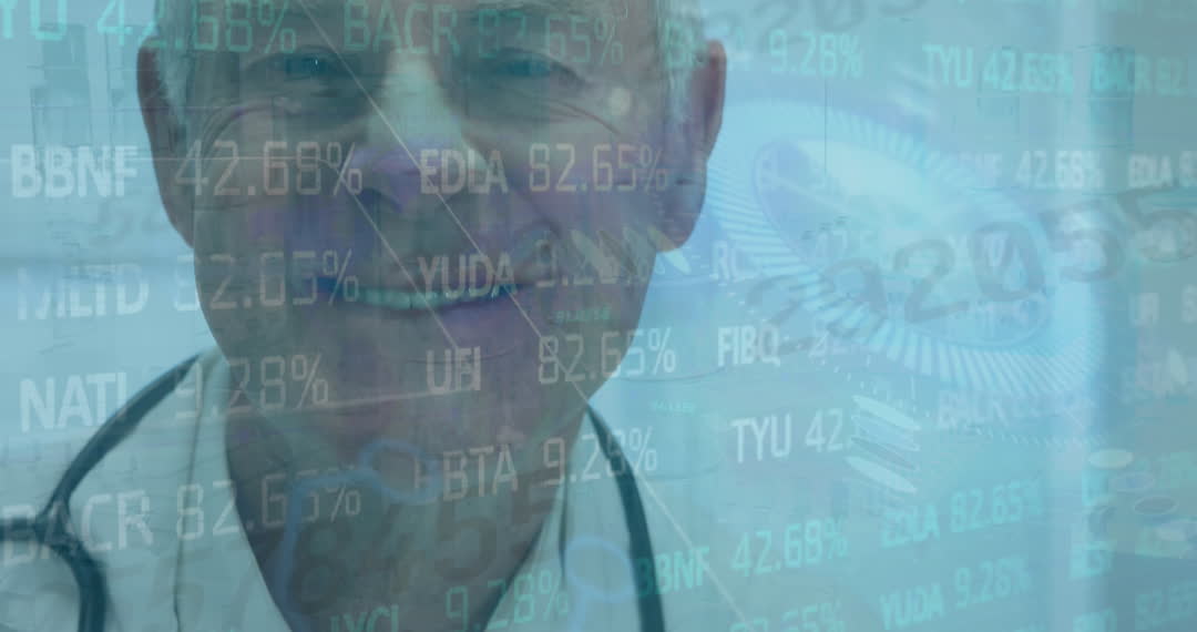 A creative blend showing a senior doctor smiling with superimposed trading data. Reflects the intersection of healthcare and financial sectors, ideal for projects that explore investment in medical fields, digital innovation, or cross-sector partnerships.