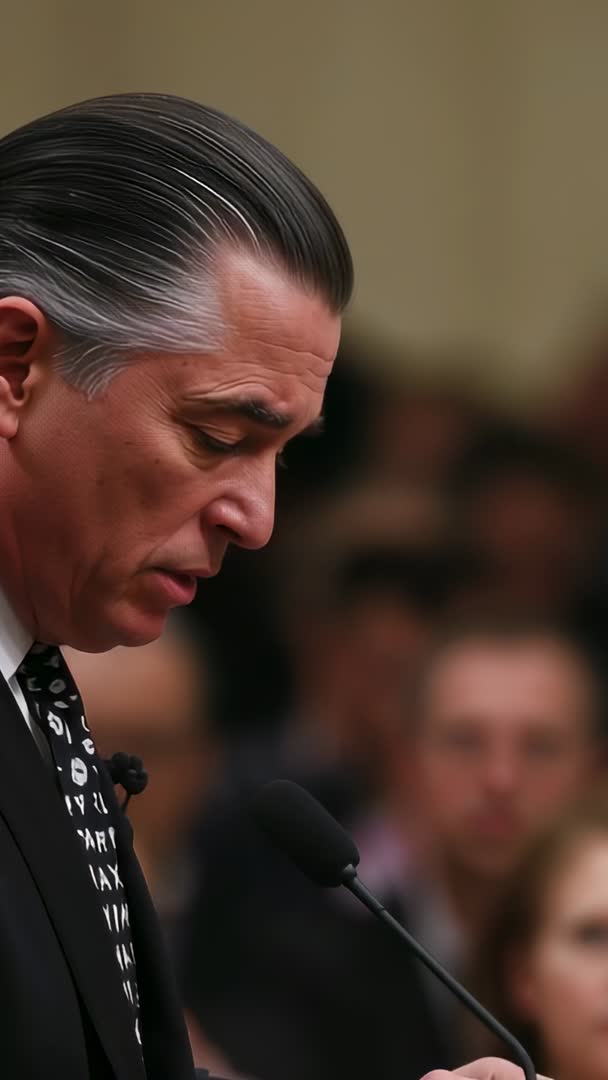 AI Generated Video. Capturing senior man in suit speaking into microphone at formal hearing, profile close-up focusing on facial expression and measured delivery. Featuring lectern, lapel mic, and blurred audience background with copy space on right for text or graphics. Providing vertical footage optimized for mobile platforms, social reels, and breaking news segments. Suggesting editorial uses: news coverage, documentary sequence, legal or political reporting, corporate compliance training, campaign content, and background for headline graphics. Recommending post production treatments: adding lower third text, subtitles, slow zoom, color grading for cinematic look, or cropping for square and horizontal layouts. Allowing seamless integration into broadcast segments, online articles, social media ads, and presentation slides.