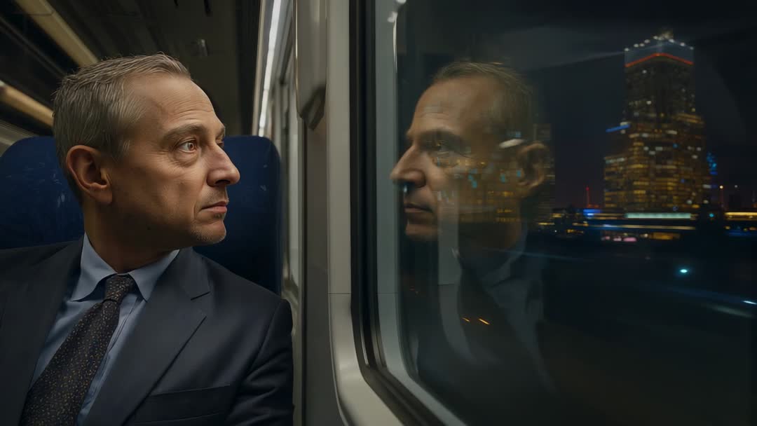 AI Generated Image. Clip showing senior executive traveling by night train, gazing through window while city lights and skyline reflecting on glass. Interior close-up concentrating on facial expression and mirrored silhouette, moody low-key lighting and cinematic color grading creating contemplative atmosphere. Serving corporate storytelling, business travel promos, financial services advertising, retirement planning spots, mental health and loneliness narratives, transit system campaigns, urban lifestyle features. Composition leaving negative space on right for titles, lower third, logo overlays. Providing cinematic b-roll, editorial cutaway, social media teaser for late-night commute themes.