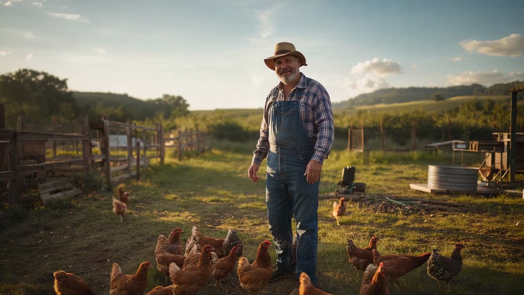 AI Generated Video. Video showing senior farmer in overalls and straw hat walking through chicken yard during golden hour, checking free-range hens and smiling. Warm side light highlighting rolling hills and rustic fences, creating calm rural mood. Composition focusing on farmer moving toward camera while flock surrounding feet, capturing authentic farm life and animal care. Useful for agriculture marketing, organic poultry branding, farm-to-table storytelling, retirement lifestyle features, educational content on small-scale farming. Suitable for website hero banners, social media reels, editorial articles about rural living, product packaging for free-range eggs, training videos for poultry husbandry. Including captions about sustainable farming, local food, intergenerational agriculture. Recommending 16:9 crop for video ads and short clips for Instagram stories.
