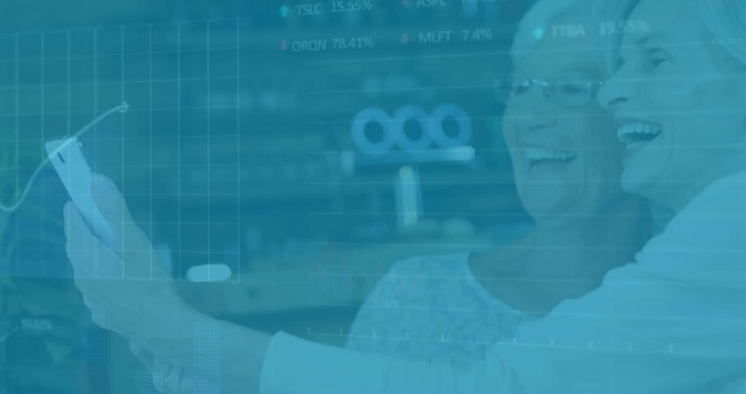 Two senior Caucasian female friends happily taking a selfie with a smartphone, highlighting the blend of social connection and technology use. Overlaid are animated graphs and trading boards, conveying concepts of market analysis, investment, and staying up-to-date. Suitable for illustrating themes of technology bridging generations, online trading accessibility for seniors, stock market education for elderly demographics, and digital transformation in retirement planning.