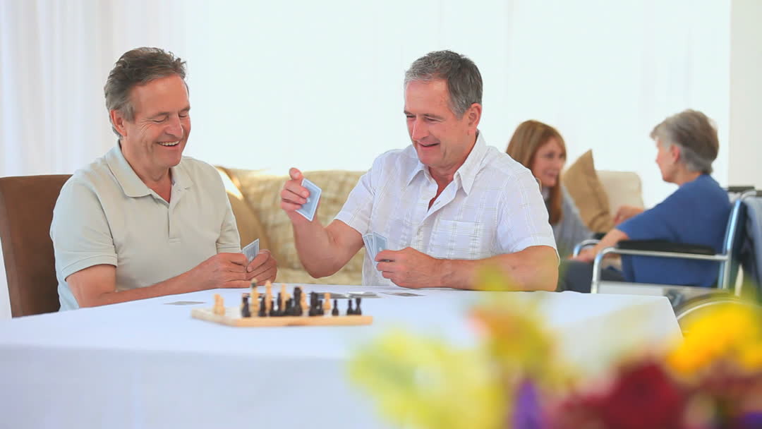 Two senior men are engaged in a card game at a table with a chessboard in a well-lit living room, indicating a casual and warm atmosphere. In the background, two women are conversing, adding a social and lively element to the setting. This can be used for themes related to retirement living, senior activities, socializing among mature adults, and relaxation in domestic environments.