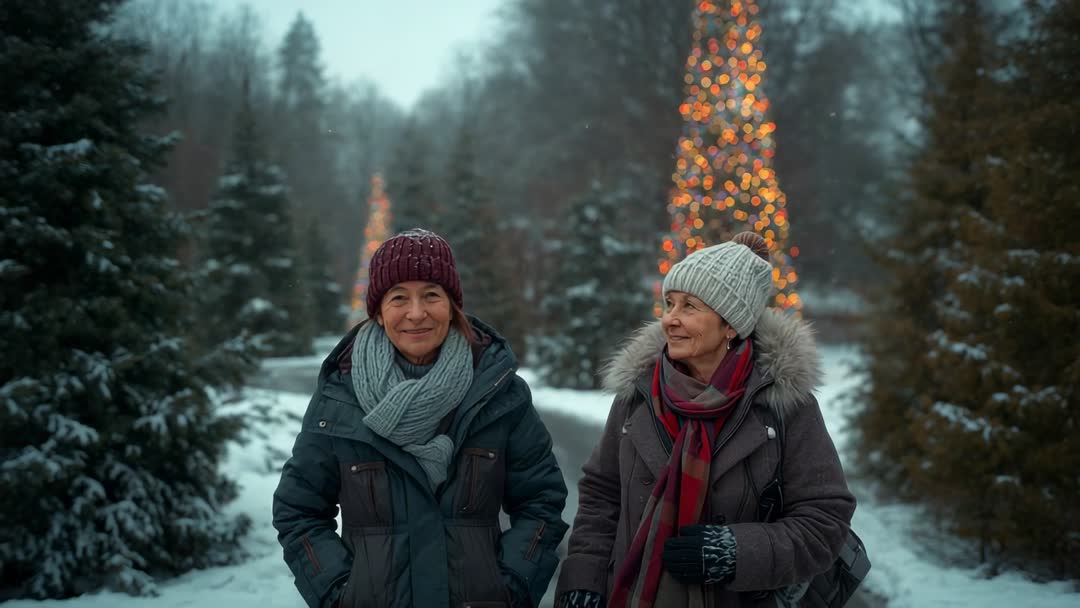 - Senior Friends Strolling Snowy Forest Spotting Festive Tree