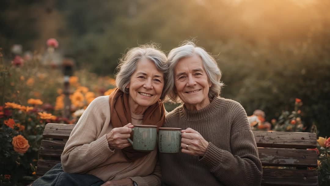 AI Generated Video. Two smiling senior women sitting on wooden bench among roses at golden hour, holding green ceramic mugs and toasting. Warm sweaters and rust scarf adding cozy autumn feel. Soft backlight creating intimate, peaceful mood with rich golden tones. Framing tight on faces and mugs, leaving blurred floral background for shallow depth of field. Usage ideas: Working well for retirement community marketing, eldercare and senior wellness campaigns, friendship and companionship stories, lifestyle blogs about aging gracefully, greeting cards and social posts celebrating long-term friendship, beverage or tea brand promotions using rustic mug styling. Suitable for hero banners, website headers, brochure spreads, print ads, blog hero graphics, social carousel posts. Editing recommendations: Increase warmth and contrast to enhance golden hour feel, crop for square or vertical formats for social platforms, add overlay text for headline or call-to-action, apply light vignette to focus on faces and mugs.