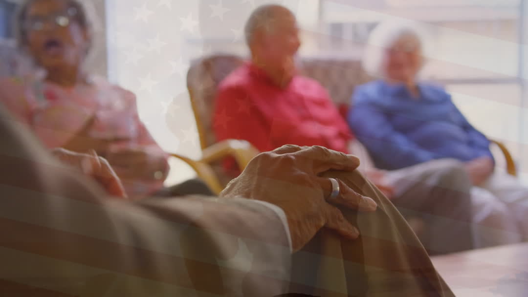 Senior citizens gathered in community center shown with American flag overlay. Symbol of unity, diversity, and community spirit, relevant for topics on social gatherings among elderly, patriotism, or national pride in the context of aging populations.