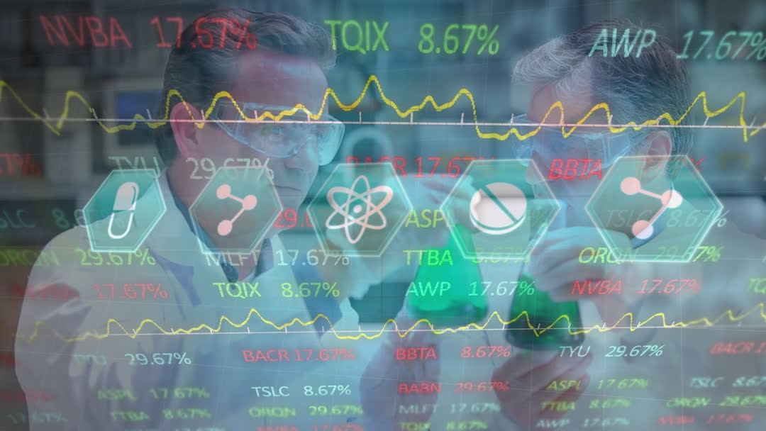 Dual exposure of senior laboratory researchers examining test samples with a digital overlay of financial and chemical data. The video symbolizes the intersection of scientific research and data analysis, emphasizing innovation. Useful for illustrating themes of research and development, financial analysis in healthcare, or scientific advancements. Ideal for articles, brochures, and presentations on medical research or data science in health technology.