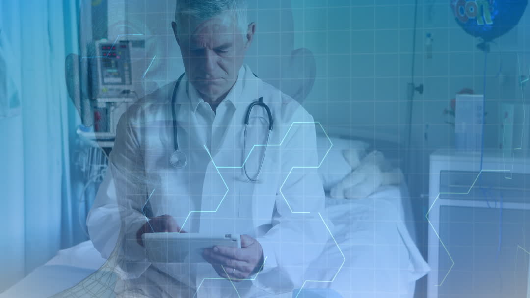 Senior male doctor engaging with digital tablet in a modern hospital setting featuring hexagon overlays symbolizing medical innovation. This could be used for articles or presentations focusing on healthcare technology, digital transformation in medicine, or modern hospital practices.
