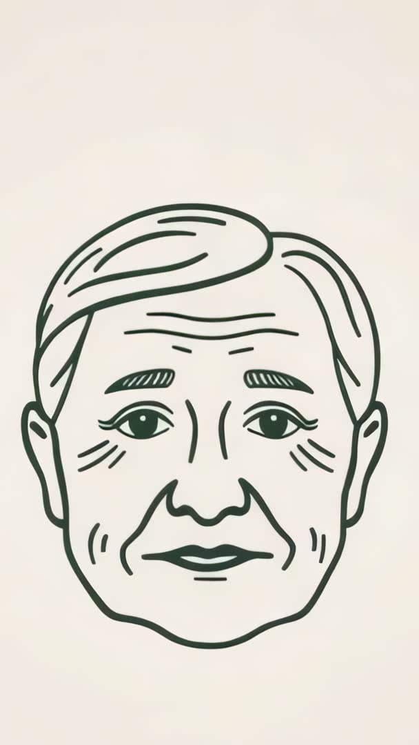 AI Generated Image. Illustrated senior male face showing natural blink after one second. Simple line-art portrait on cream backdrop featuring neutral expression and subtle wrinkles. Animation looping seamlessly for short vertical clips. Suiting health and wellness content, eldercare communication, medical explainer videos, telehealth UI, social media stories, mobile app onboarding, patient education, blog headers, presentation slides, video intros. Conveying calm, trust, empathy, age-related discussion, vision and eye health topics, caregiving messages. Combining with text overlay, voiceover, background music for quick social media spots or informational videos. Editable for color and pacing, enabling brand matching and timing adjustments. Working well as friendly character avatar, instructional animation element, waiting screen animation, animated icon for apps and websites.
