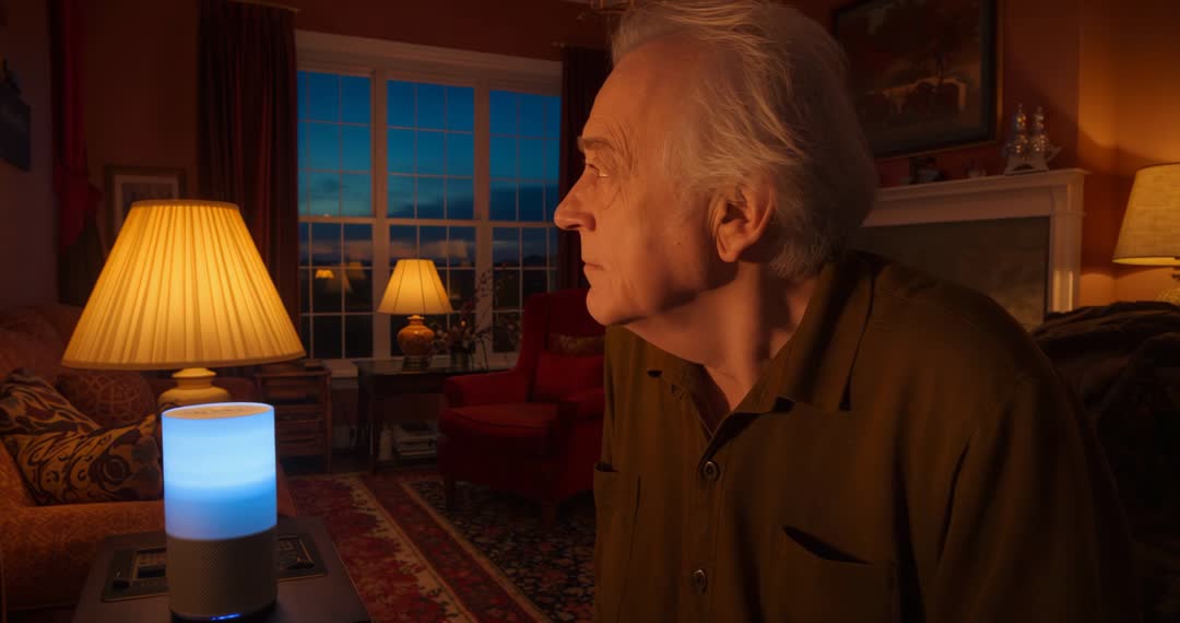 - Senior Man Activating Smart Lamp for Ambient Living Room Lighting