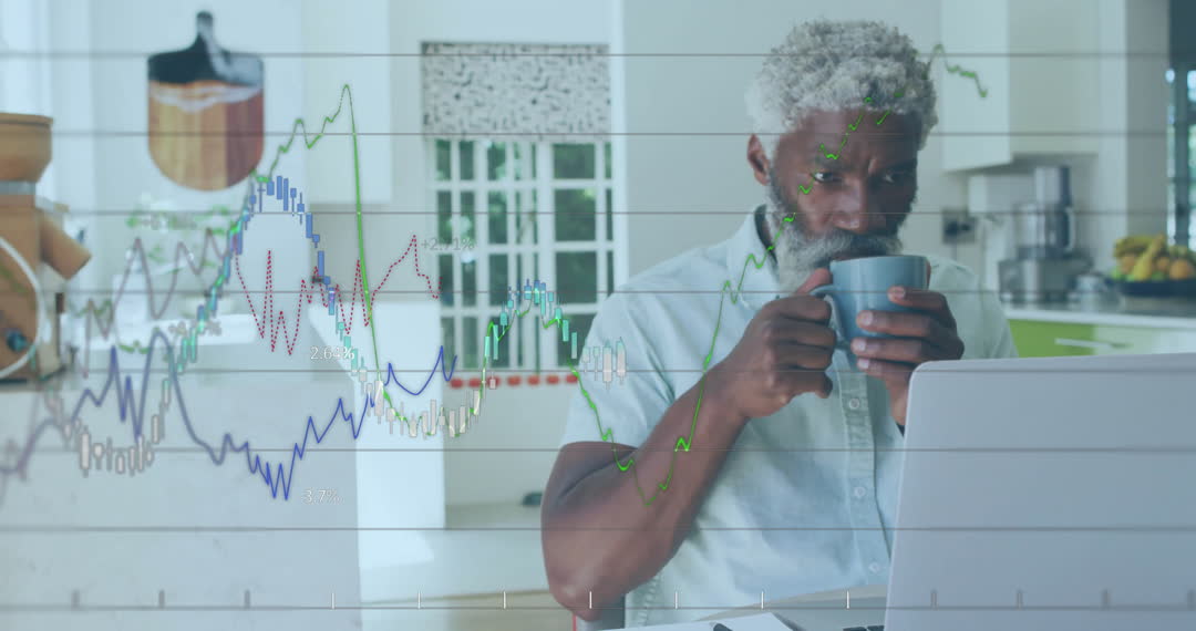 Senior African American man engaged in examining fluctuating financial charts while sitting at home. This concept captures technology use in personal finance management. Ideal for illustrating articles on investor behavior, personal finance tips, remote work setups, and technological engagement by older generations.