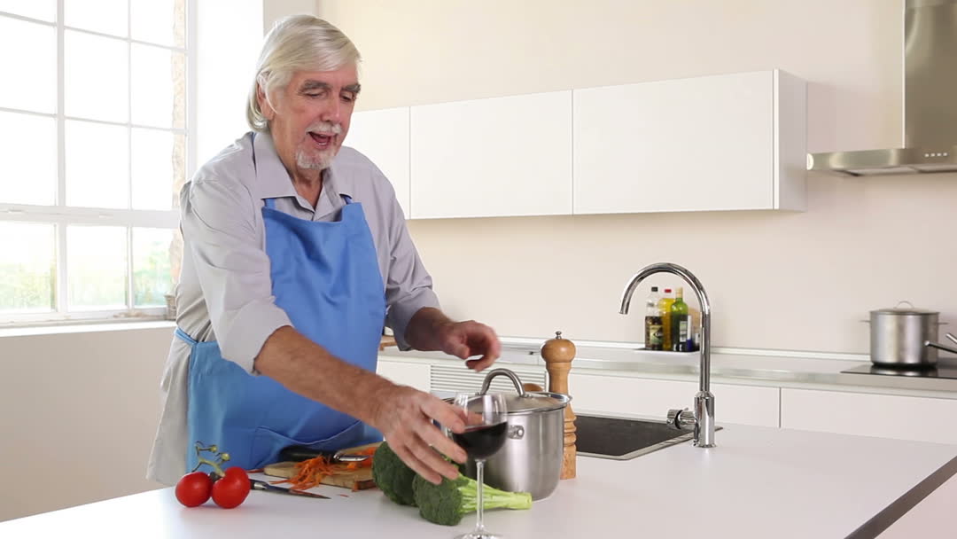 Senior Man Cooking in Modern Kitchen While Enjoying Red Wine Video