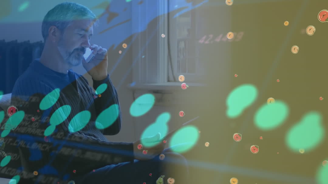 A senior man is talking on a smartphone from his home, with digital data and analytics visuals overlaying him. This visually compelling concept illustrates blending modern technology with daily life. Useful for representing themes of remote work, technological integration in business, or digital communication, appealing to demographics focused on senior engagement with technology.