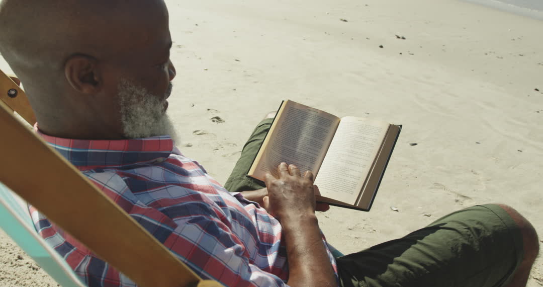 - Senior Man Enjoying a Book on the Beach in Sunny Weather