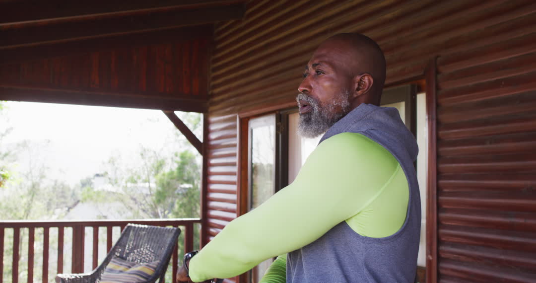 An elderly African American man practices yoga on a balcony of a wooden cabin, surrounded by tranquil natural scenery. Perfect for themes of relaxation, mindfulness, healthy aging, and personal wellness. Useful for lifestyle, health, or travel publications focusing on peaceful retreats or encouraging physical activity in senior adults.
