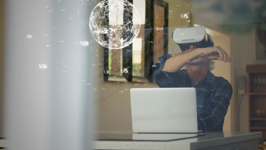 Older man sitting in home environment wearing a virtual reality headset, engaged with digital technology, exemplifying current trends in VR use. Animated globe of connections illustrates interconnected data and global connectivity, reinforcing themes of innovation and technological advancement. Useful for publications on digital transformations, tech adoption by older populations, and virtual reality applications in everyday life.