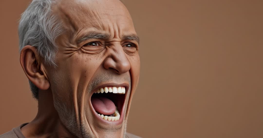 AI Generated Image. Image featuring a senior man displaying deep emotions with his mouth wide open and eyebrows drawn together against a brown backdrop. It conveys a sense of intensity and raw emotion. This visual can be utilized in projects about human emotions, expressions, and storytelling, standing in as a chilling, impactful addition to narratives or emotional presentations.