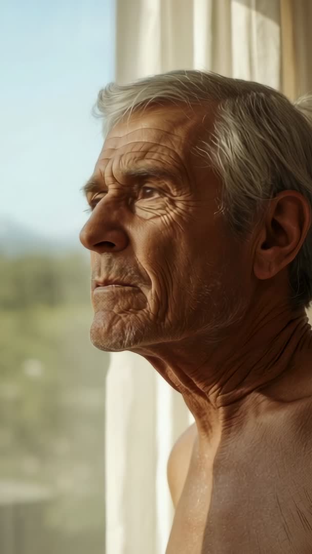 AI Generated Image. Vertical video showing senior man shirtless, standing at window, gazing into distance as sunlight moves across face and curtain. Close-up side profile capturing deep wrinkles, textured skin, and quiet expression, evoking dignity and reflection. Visual working well for senior care marketing, retirement planning campaigns, healthcare and wellness promotions, mindfulness and mental health content. Ideal for social media vertical ads, Instagram Reels, TikTok clips, mobile-first storytelling, or documentary sequences. Footage fitting as opener for longer film, background for voiceover, interview cutaway, or thumbnail still. Color palette offering warm natural tones and soft contrast, easy to grade and integrate into branding. Suggested usage: website hero clips, brochure headers, eldercare facility promos, counseling and grief support resources, lifestyle blogs, and stock footage libraries.