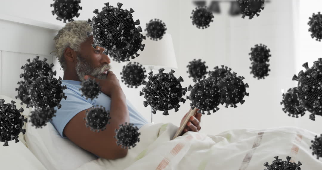 This digital composition features an elderly man in bed with a superimposed graphic of virus symbols. The combination highlights themes of health concerns and the pandemic's impact on seniors. Perfect for materials related to healthcare information, elder care, and raising awareness on medical issues affecting the elderly population.