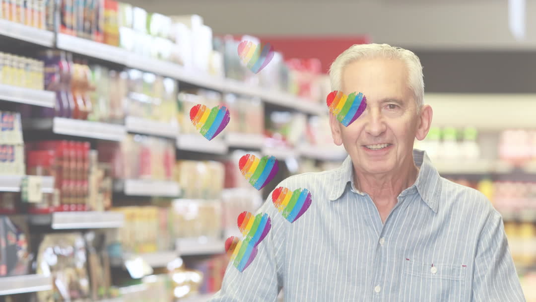 - Senior Man in Store with Digital Rainbow Heart Overlay