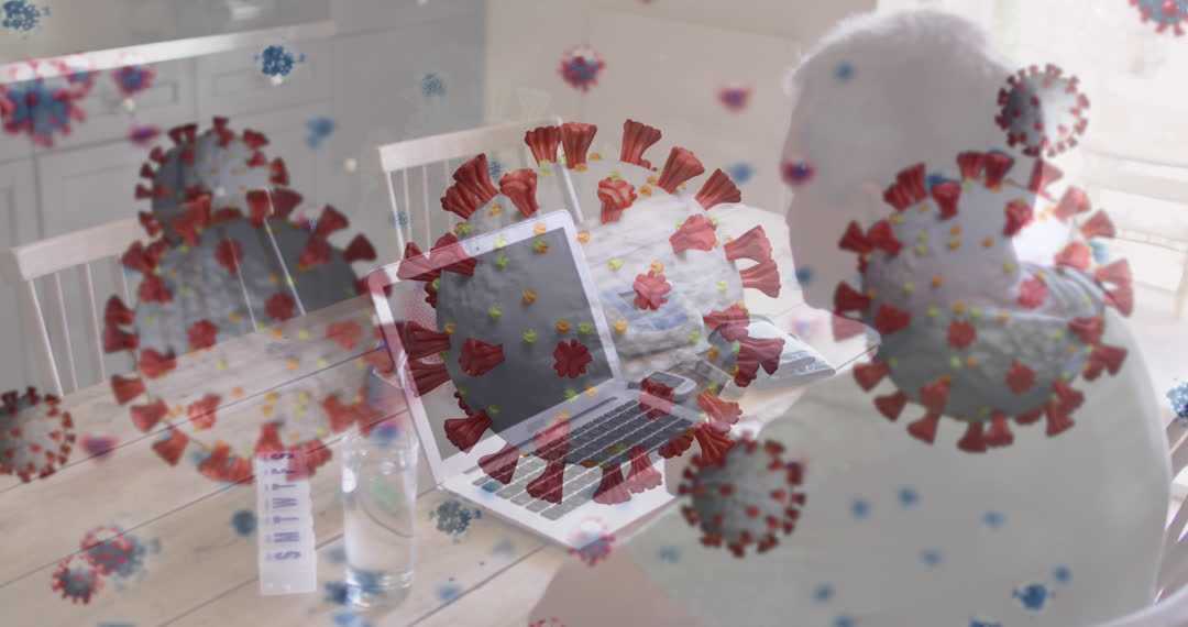A senior man engaged in online activity with an emphasis on a backdrop of virus cells, highlighting the intersection of technology use and pandemic concerns. Perfect for illustrating the impact of COVID-19 on elderly individuals and their growing reliance on technology for communication and daily activities.