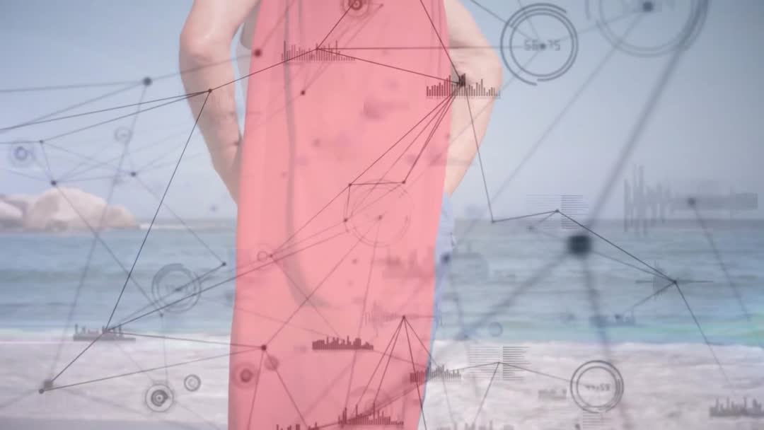 Video captures senior male at beach gazing across water, illustrating tranquil moment juxtaposed with overlaid network graphics suggesting modern technology monitoring. This mix of nature and technology offers versatile use for topics on balancing tech and life, innovations in senior care, or futuristic concepts in everyday moments.