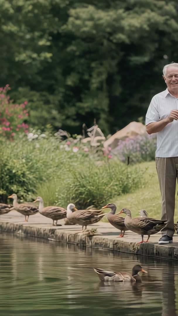 AI Generated Video. Video showing senior man smiling while standing beside ducks along park pond. Camera keeping steady vertical framing with ample copy space on left for text overlay. Scene highlighting peaceful outdoor moment with gentle water ripples, lush greenery and flowering garden beds. Footage working well for wellness, retirement living, elder care promotion, mindfulness and nature content. Footage fitting social media vertical formats such as Instagram Reels, TikTok, YouTube Shorts, mobile ads and hero banners. Licensing allowing use in commercial projects, websites, brochures and video ad campaigns.