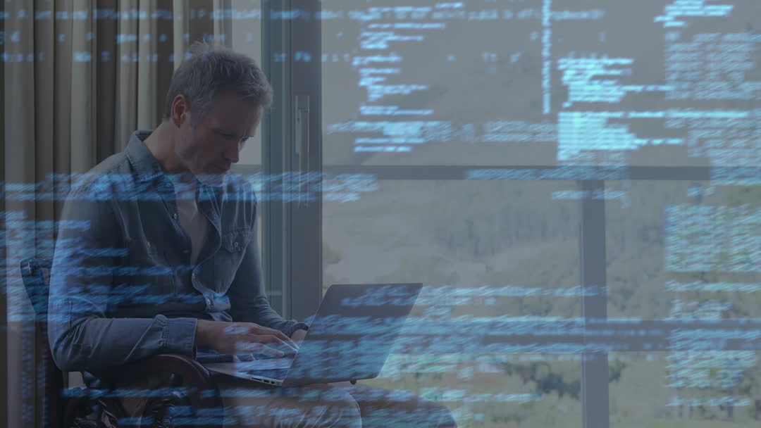 Senior Man Using Laptop with Code Overlay at Home Video