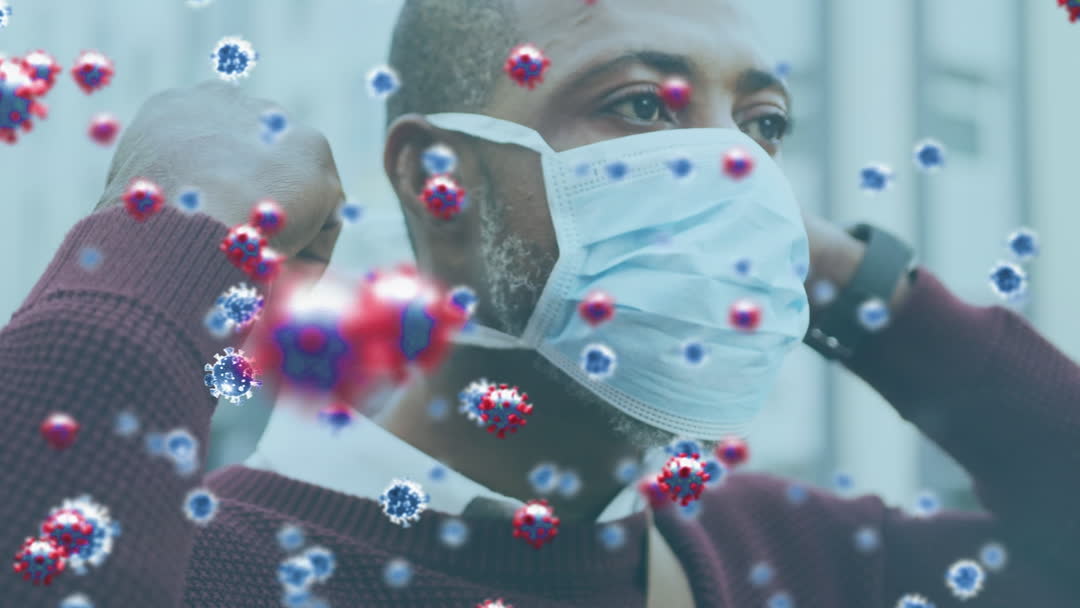 Image depicting an African American senior man wearing a medical face mask. Virus cells are illustratively floating around him, conveying the pervasive nature of the Covid-19 pandemic. This can be used in articles related to health safety, pandemic awareness, and public health initiatives.