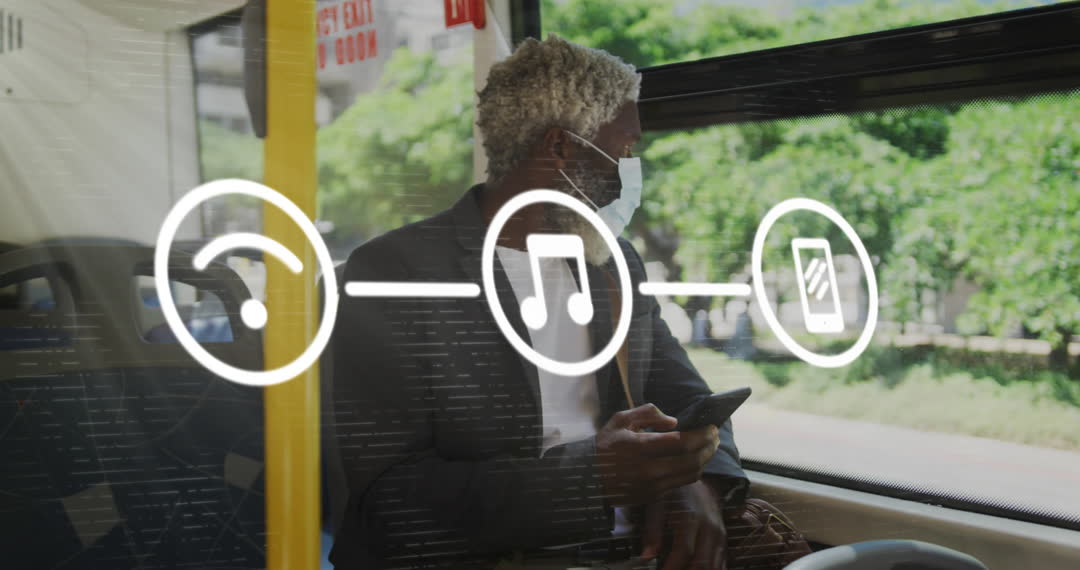 Senior man sits on public transport wearing a protective mask, using his smartphone. Digital icons of audio and connectivity emphasize technology use in everyday life. Perfect for depicting urban commuting, safety during travel, or technology's impact on senior citizens. Useful in articles about public health, tech adoption by seniors, or urban lifestyle visuals.