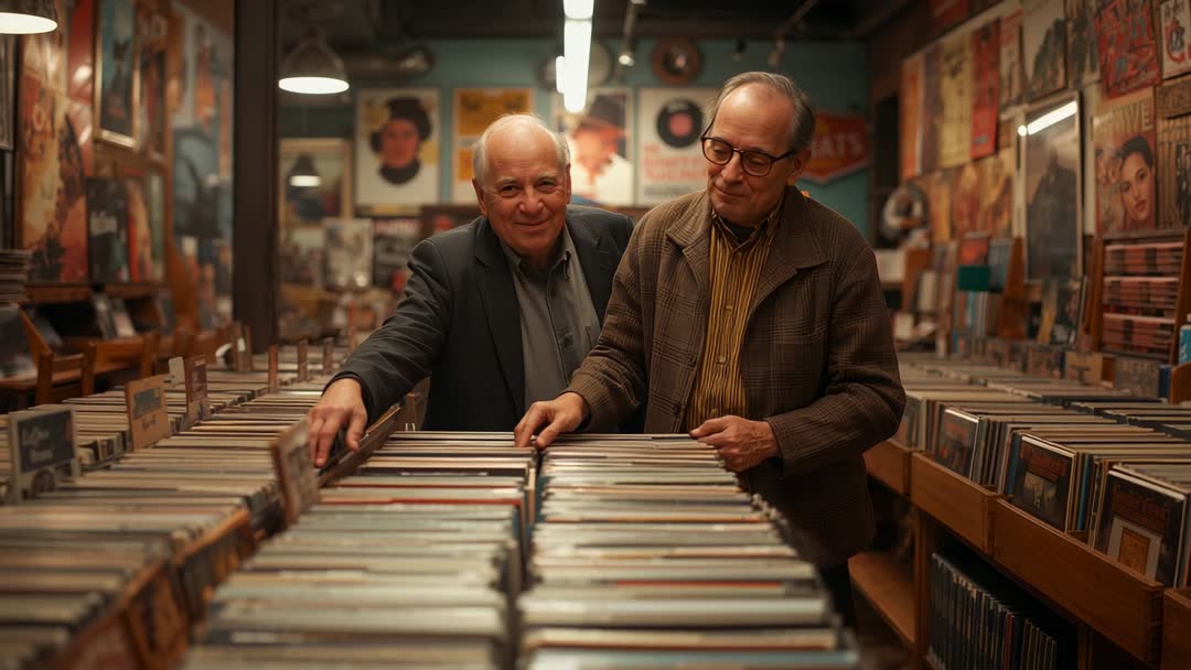 AI Generated Image. Clip showing two senior men browsing vinyl records in cozy retro record store, flipping through bins while smiling and chatting. Warm ambient lighting and rows of colorful album covers creating nostalgic atmosphere. Camera following hands as they scan labels and pull out records, close-ups of worn sleeves and spines providing tactile detail. Footage capturing relaxed pace, friendly interaction, and appreciation for analog music culture. Use for small business marketing, independent record store promotion, senior lifestyle content, nostalgia and music articles, social media reels, commercial spots, documentary b-roll, website headers, playlist background, and print editorial. Clip suiting campaigns that emphasize community, hobby culture, intergenerational connection, or vinyl revival trends.