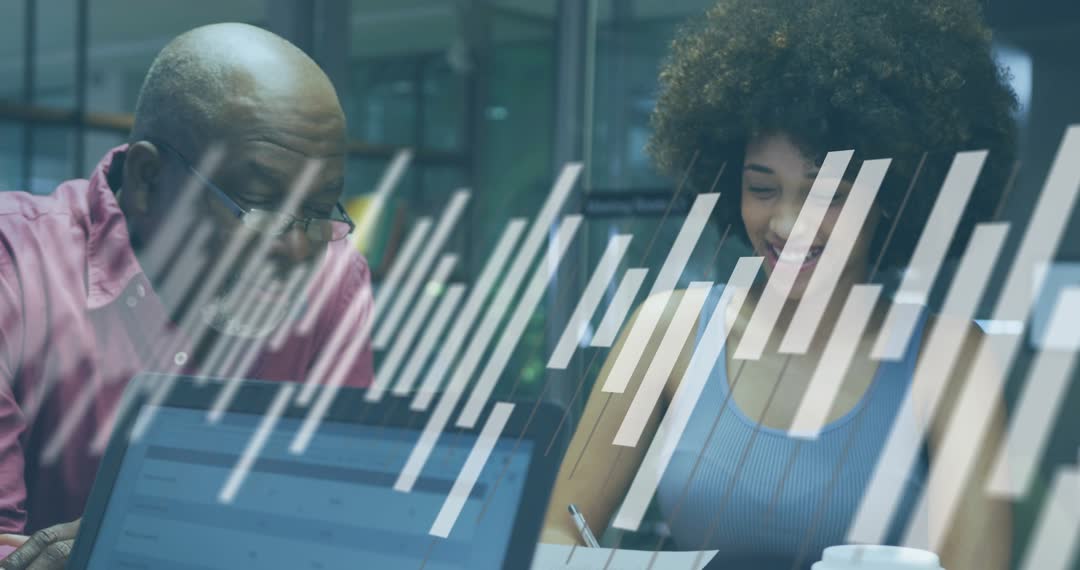 - Senior mentor guiding young professional over laptop with animated data bars for collaboration