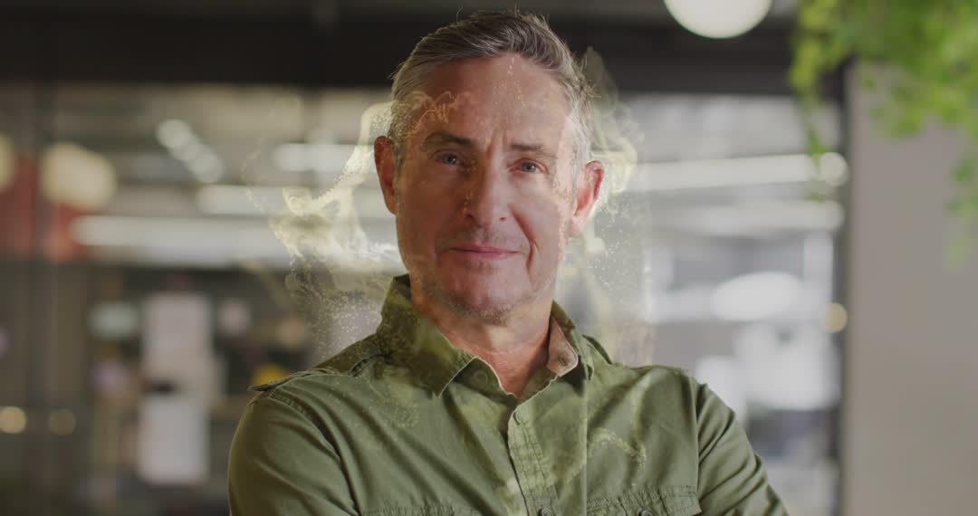 Featuring senior office manager standing with arms crossed, smiling, eyes gently closing, head tilting, golden aura glowing around head and shoulders against soft bokeh of modern open-plan office with glass partitions and warm backlight. Cinematic shallow depth of field drawing focus to expressive face and confident posture. Visual conveying leadership presence, calm confidence, radiant wellbeing, inner focus, professional gravitas. Useful for leadership training videos, executive coaching courses, personal branding reels, corporate website hero banners, LinkedIn profile clips, keynote presentation openers, wellness at work campaigns. Easy to pair with motivational copy, warm color grading, lower-third titles, or animated logo reveal. Delivering versatile clip for conveying trust, experience, positive energy, career success.